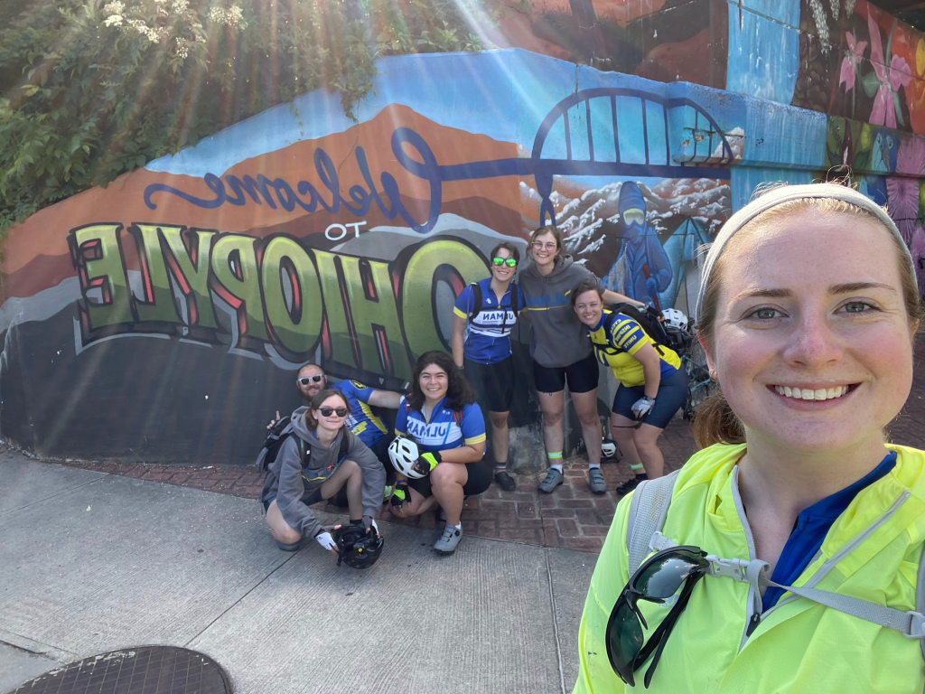 Yesterday we departed Confluence and took a nice flat, slightly downhill gravel path almost all the way to Elizabeth. I dedicated my day to Brittany, a young woman who was a member of the host church and passed from cancer a few months ago. It was a chilly morning and the trail was shaded most of the day so it was nice in terms of weather. The morning was really beautiful– we decided to “megagroup”, or ride with multiple ride groups together since we were on a trail away from cars, and we connected a few speakers to have some fun music to keep the energy up. Unfortunately we later had some breakdowns in terms of group communication and team riding etiquette which really overwhelmed me. We had a half-baked plan to go slightly off route and see Fallingwater, one of Frank Lloyd Wright’s houses, but I ended up turning back with about half the group that wanted to go because the road was so steep and heavily trafficked with no shoulder. I think the stress and intensity of 4K just finally caught up to me and made me begin to doubt my abilities as a ride director. I came very close to racking for the day because I was so overwhelmed but a few of my new friends were really kind and comforted me through the day.