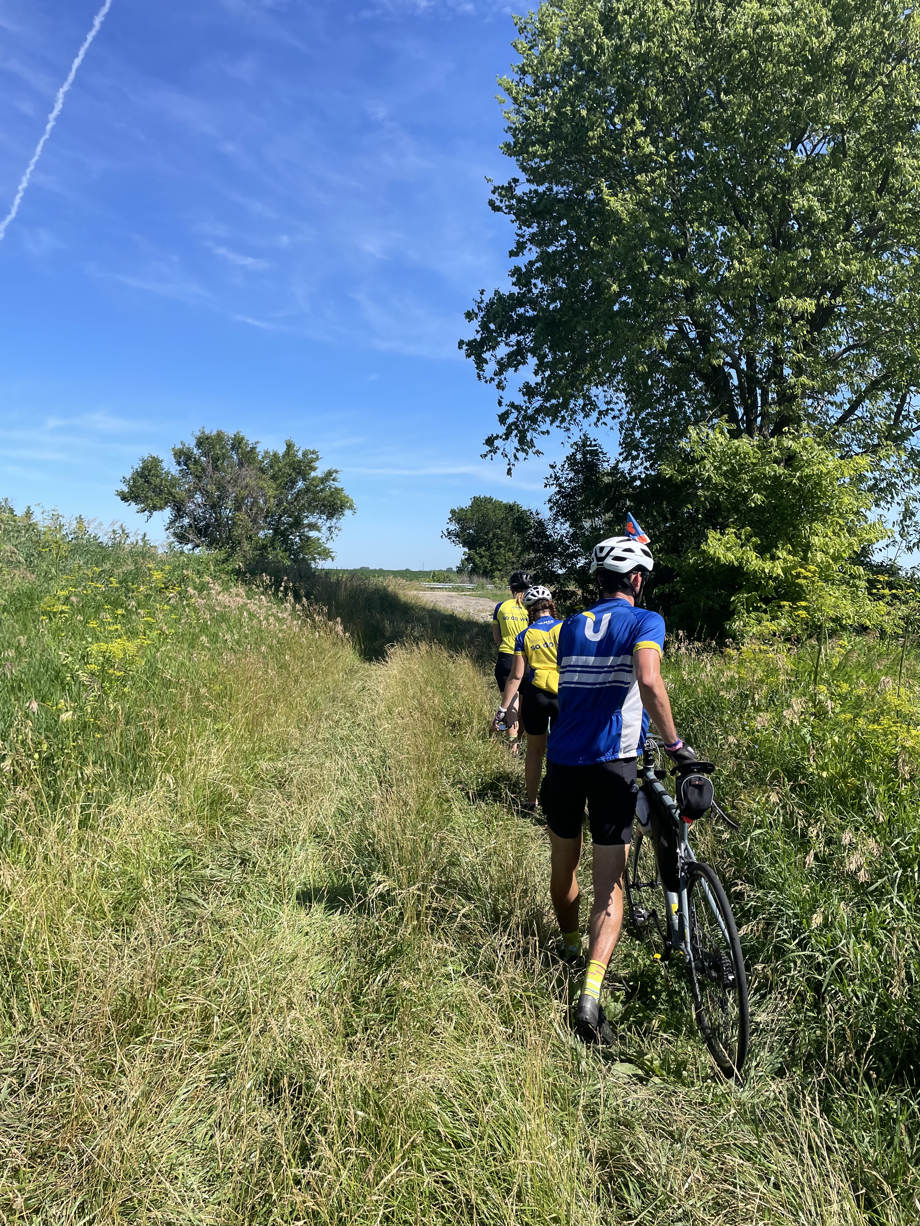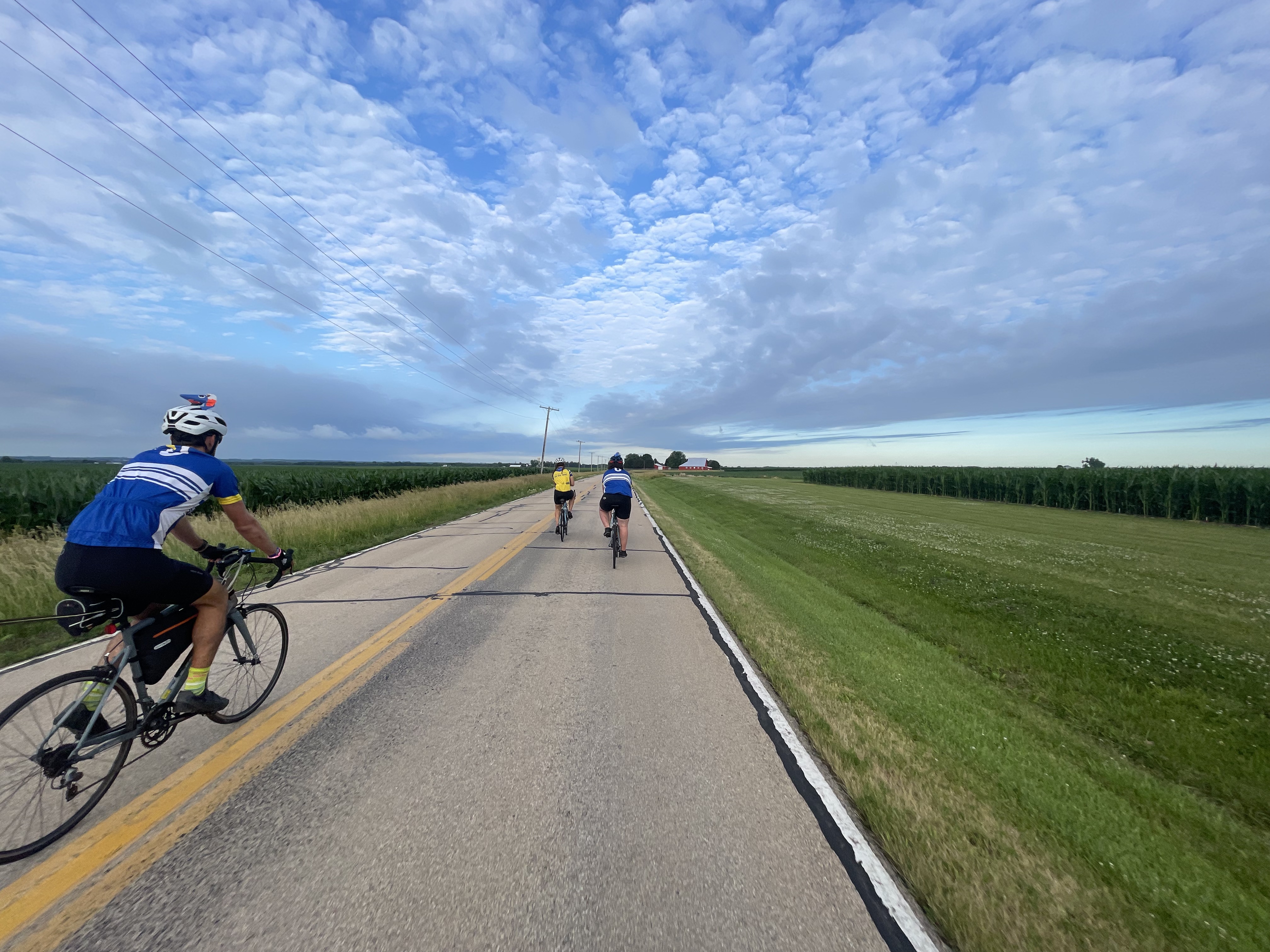 Today was probably the most challenging day of the 4K thus far, and that’s saying something! We had some sort of last-minute host changes which put a very long ride between our hosts in Princeton and Iowa City. The route Ulman gave us was 164 miles; we would’ve had no choice but to bike as far and as long as we could with daylight and rack the rest of the way. We used a different mapping service and found a 123-mile route, which most of the team felt up to attempting. Bailey even got back on her bike for the first time in a while to see how her knee felt for a few miles, and we all had a great time cheering her on!