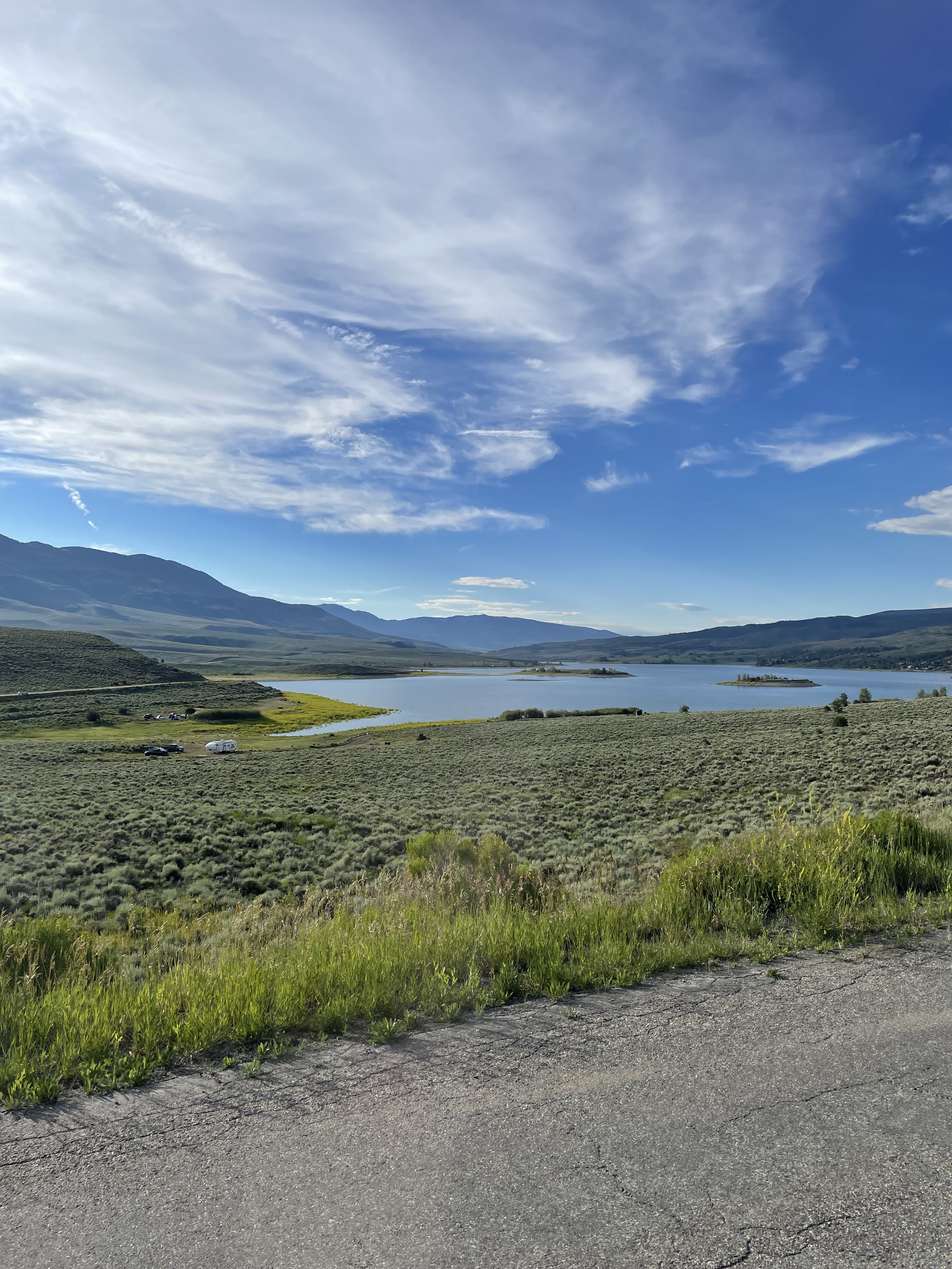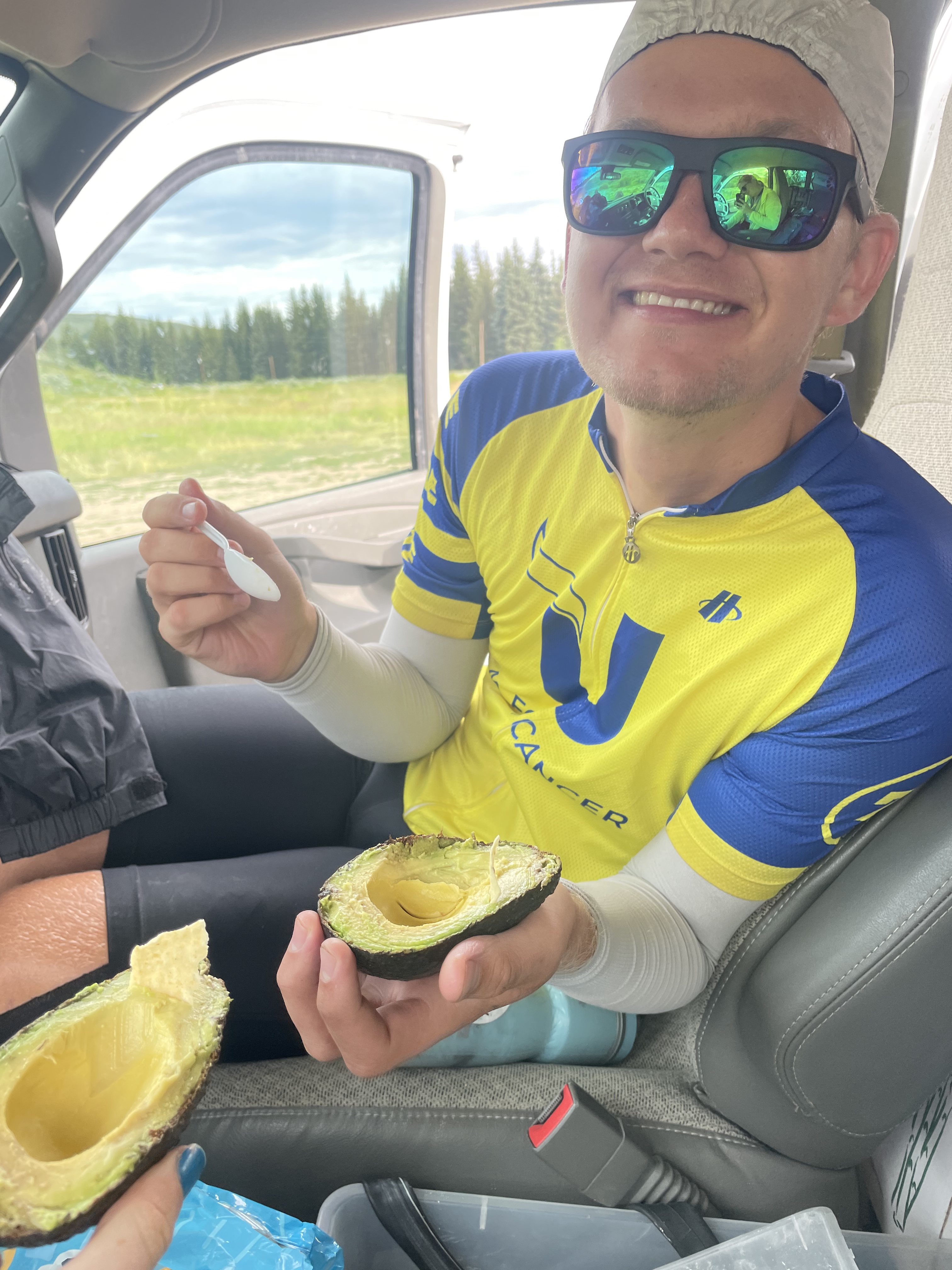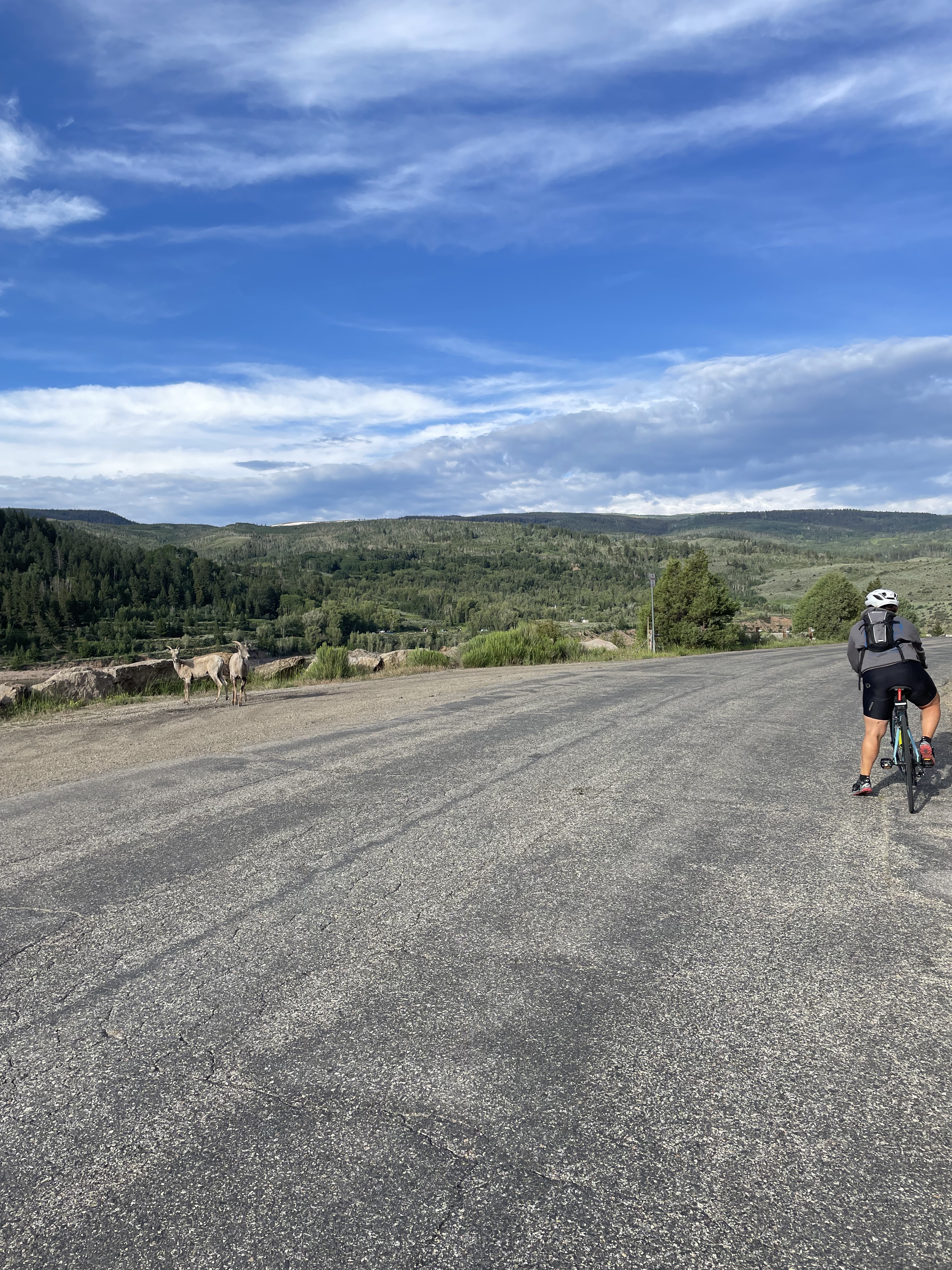 We did climbing partners again but Bailey wisely chose to rack and give her knee some rest. I rode with Rose and we enjoyed a beautifully scenic and cool morning toward Vail. We were on a highway for a while but eventually detoured on a county road around a huge reservoir. There we saw a ton of wildlife, including some mountain goats, a deer, and some sort of wild dog. We had a water stop at an equally scenic spot along a river, which was also the site of a cemetery for some of the settlers of the area. At some point we acquired a bag of avocados that were about to go bad so Santi and I assembled some gourmet water stop snacks and made “guac”.