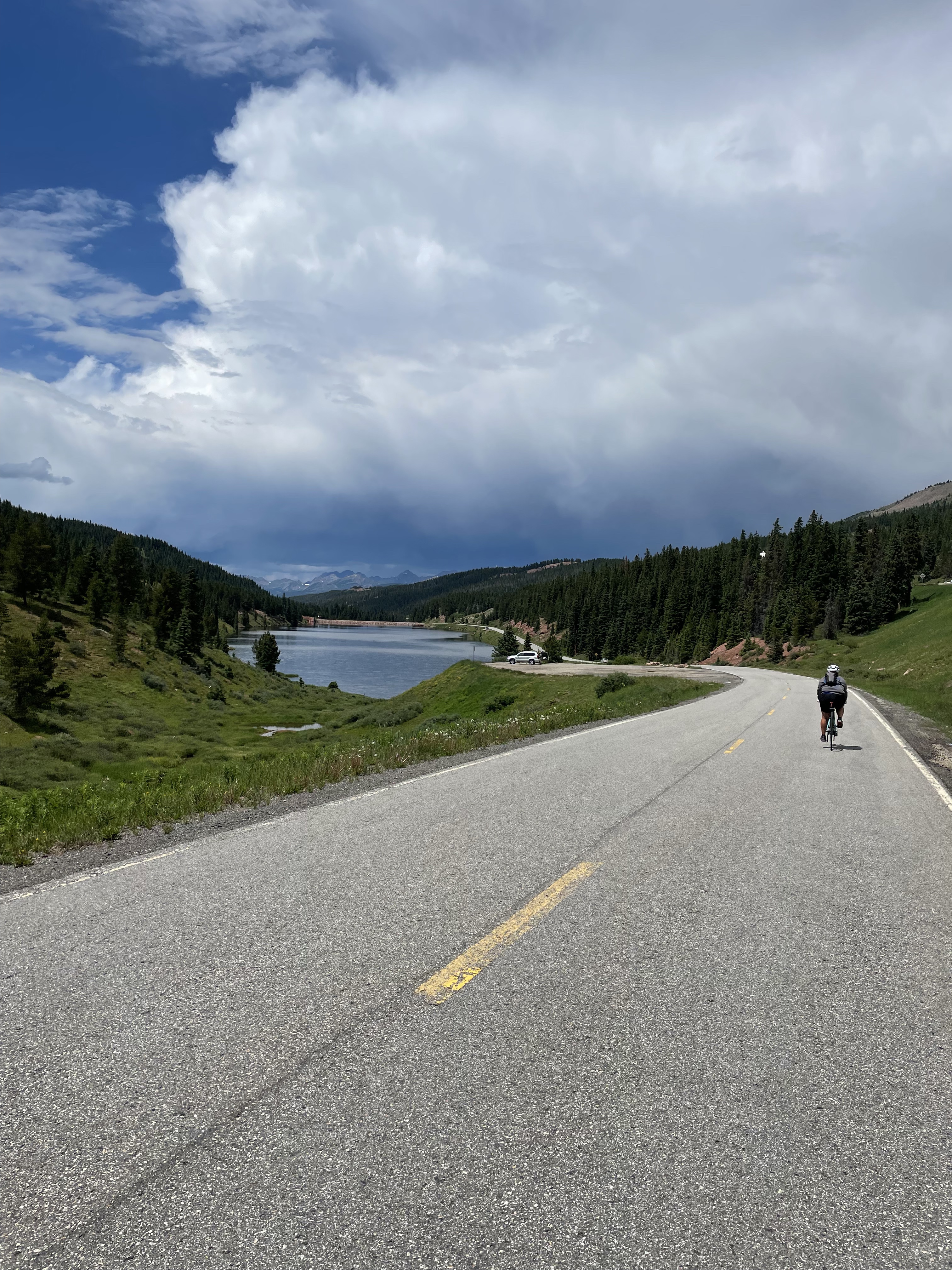 The rain held off for the most part while we were actually climbing. The trail was very nice but underwhelming compared to Trail Ridge. We were basically in a valley in between two highways and slowly climbing up. There were no sweeping views but the valley was pretty. The top was similarly underwhelming; we were close to 11,000 feet but well below the tops of the mountains and the trail took us to was basically a construction site parking area. We met the water van there, refueled, and picked up Briana who had racked earlier in the day for the descent.