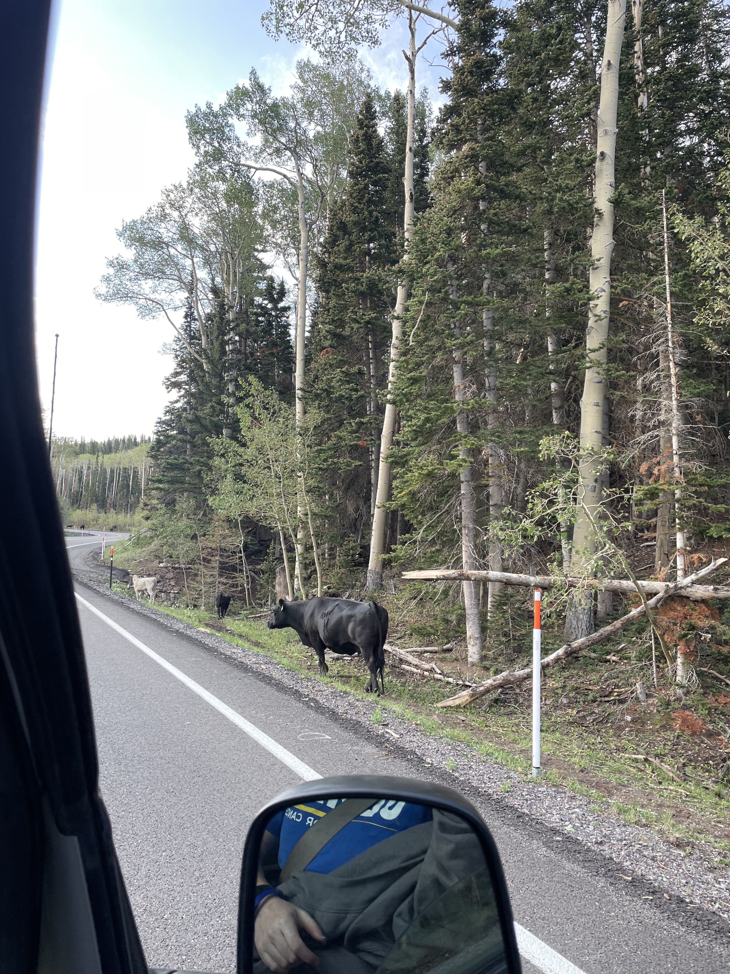 We had a beautiful but mildly harrowing drive through Dixie National Forest to Escalante. The sky was incredible the entire drive, light purple clouds and blue skies with sun streaming through the clouds despite the fact that we were well past sunrise. We stopped at most of the overlooks along the way to appreciate the views, and then ruined the moment for everyone around us by screeching out of the parking lots. We also saw a TON of cows. They are open range in the forest and many of them were grazing and wandering right along the road. There were lots of very cute baby cows!