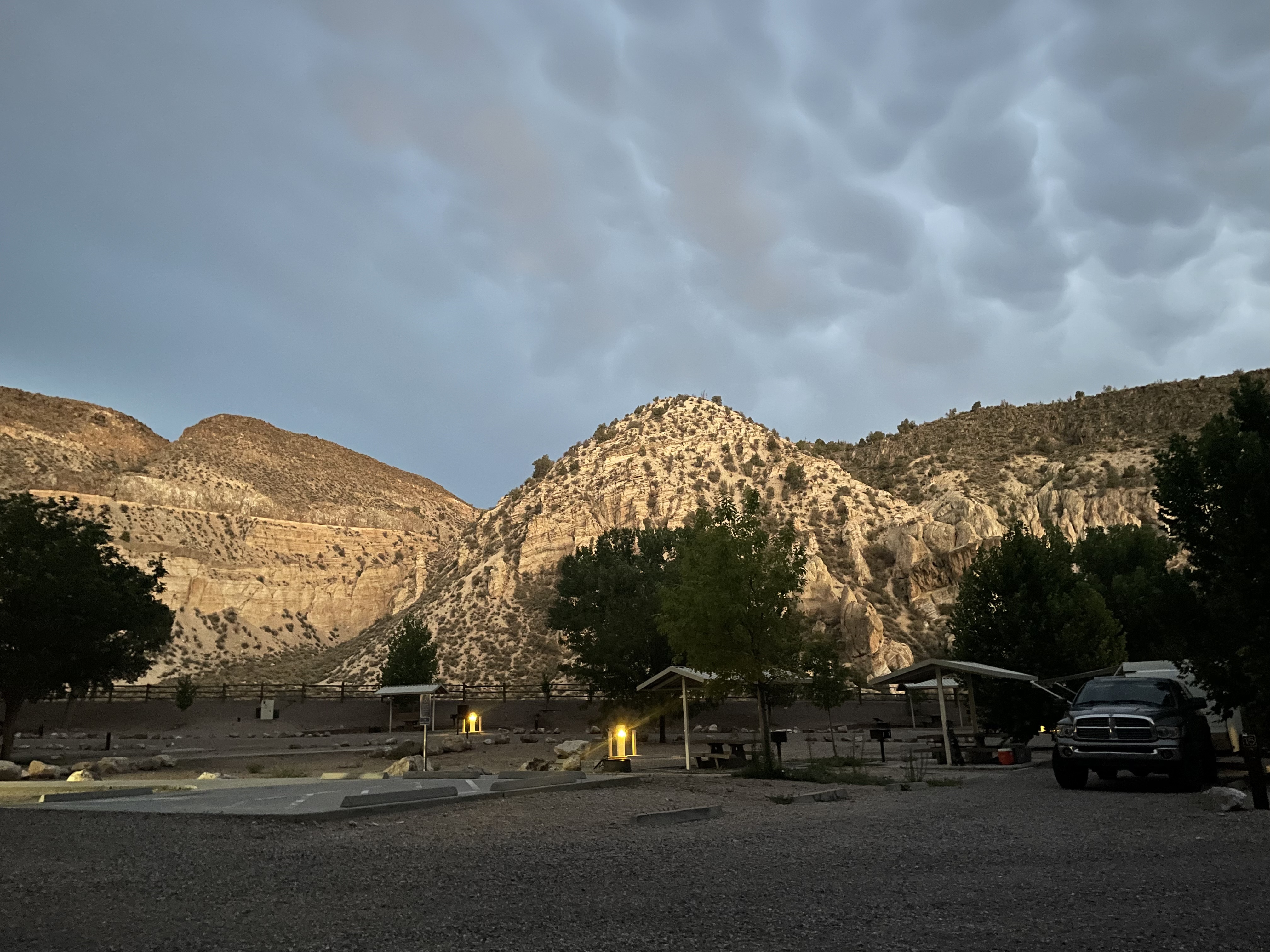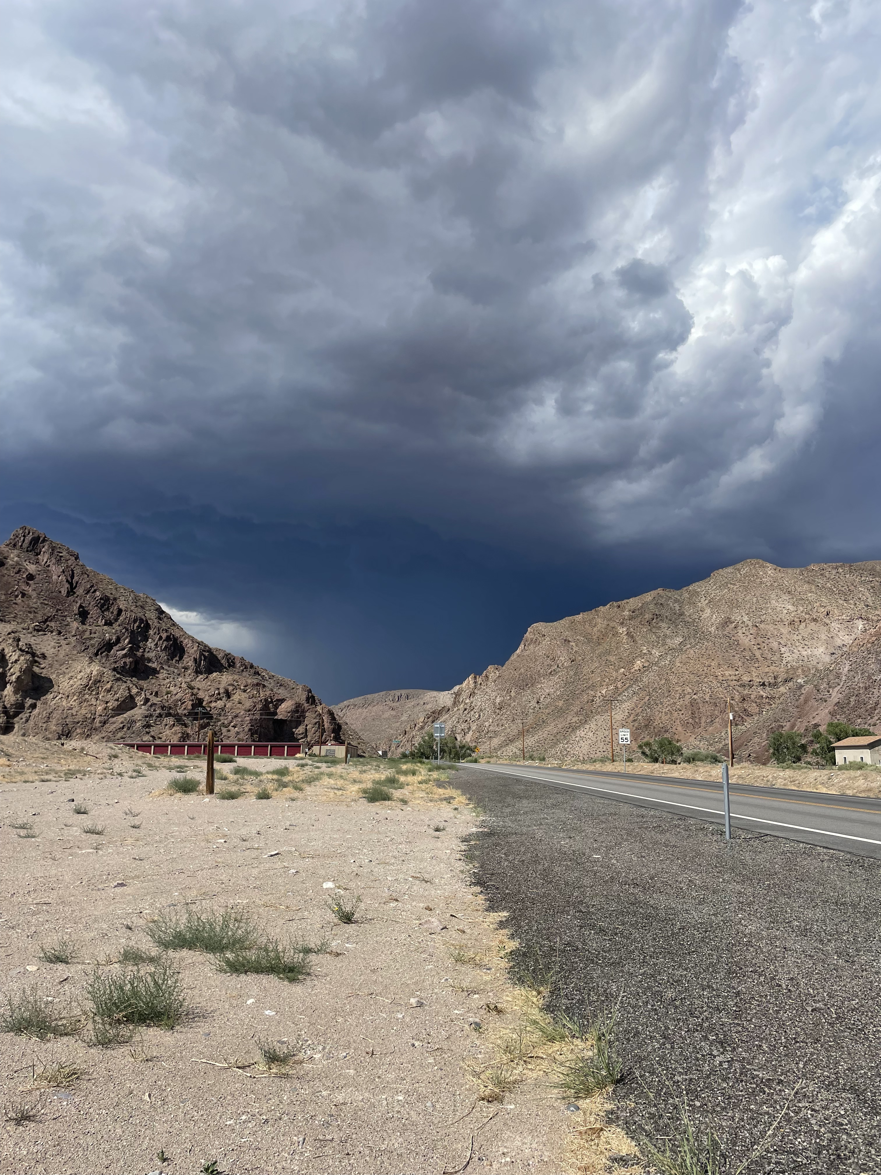 From there I felt awful for the rest of our climbing for the day. There was no shade at the water stop and I was overheating; I filled up my water when I got there but didn’t refresh it before I left so it was warm and I had nothing to cool down with. The climb wasn’t anything crazy but felt so hard and I was definitely slowing my group down. Close to the top we passed Mike, who I dropped back with to give him some company and to give myself a break. At the top we met up with Glenn and Bailey and descended as a group. As upset as I was for feeling so weak, nothing is better than a good descent! We had incredible views of some mountains and could see for miles. At the bottom we stopped for lunch at a friend of a 4K alum, Leslie, who is currently living in Caliente for the summer. After lunch we headed to Kershaw-Ryan State Park, where Leslie works, as yet another storm was rolling in! We have had rain almost every day in Utah and Nevada which I did not expect at all. Rain is an inconvenience, especially when we’re camping, but I appreciate the cooler temperatures.