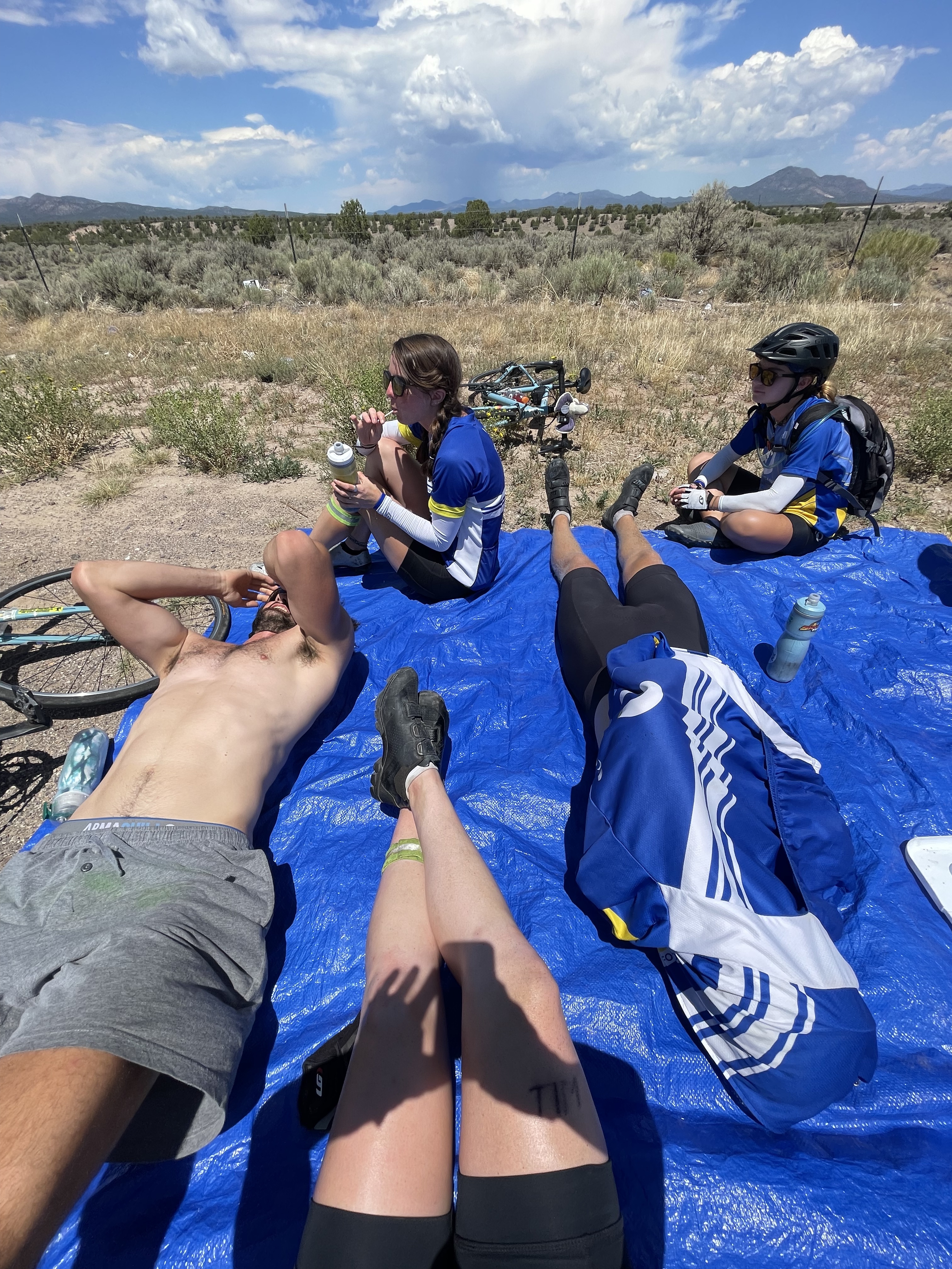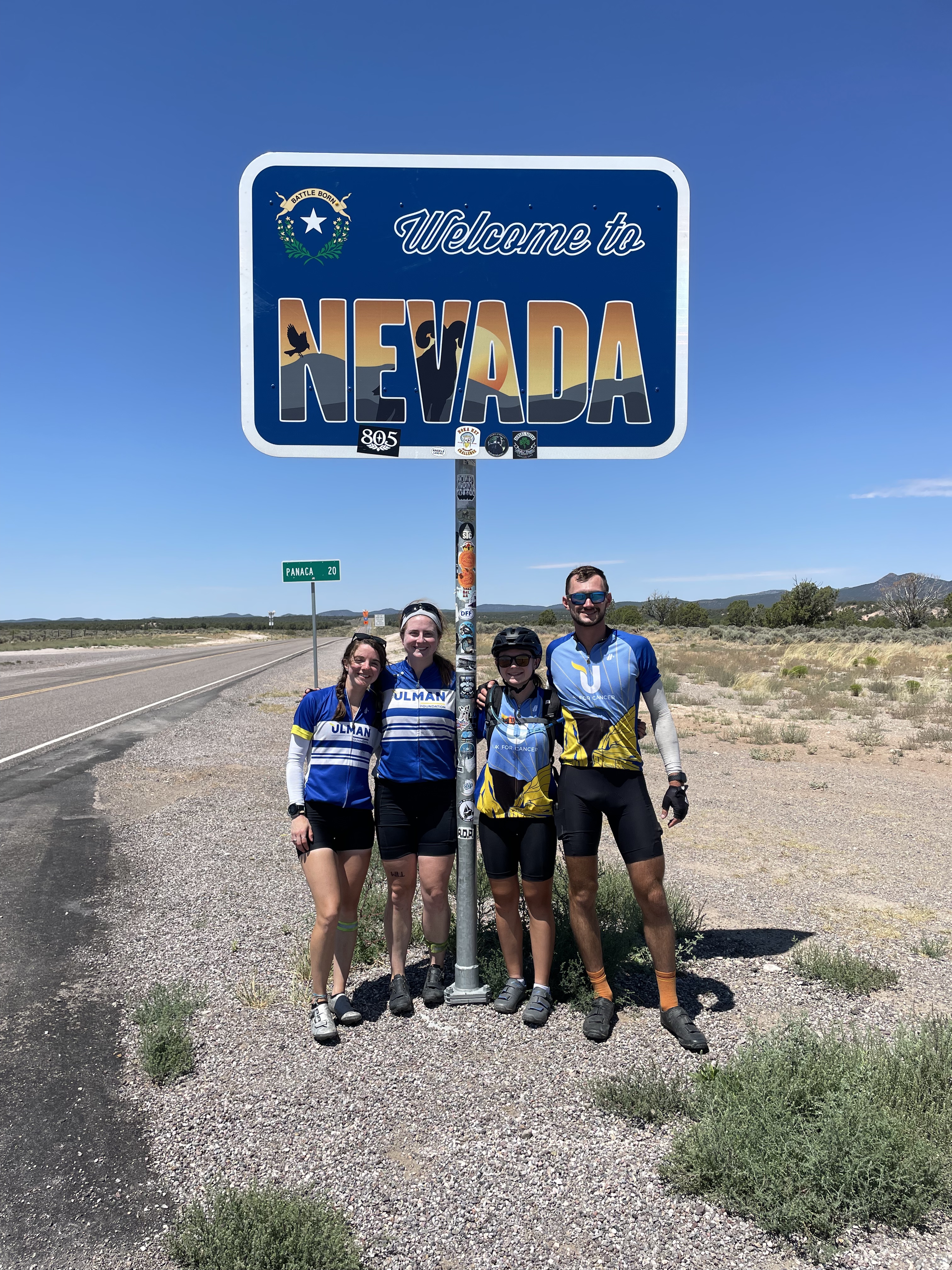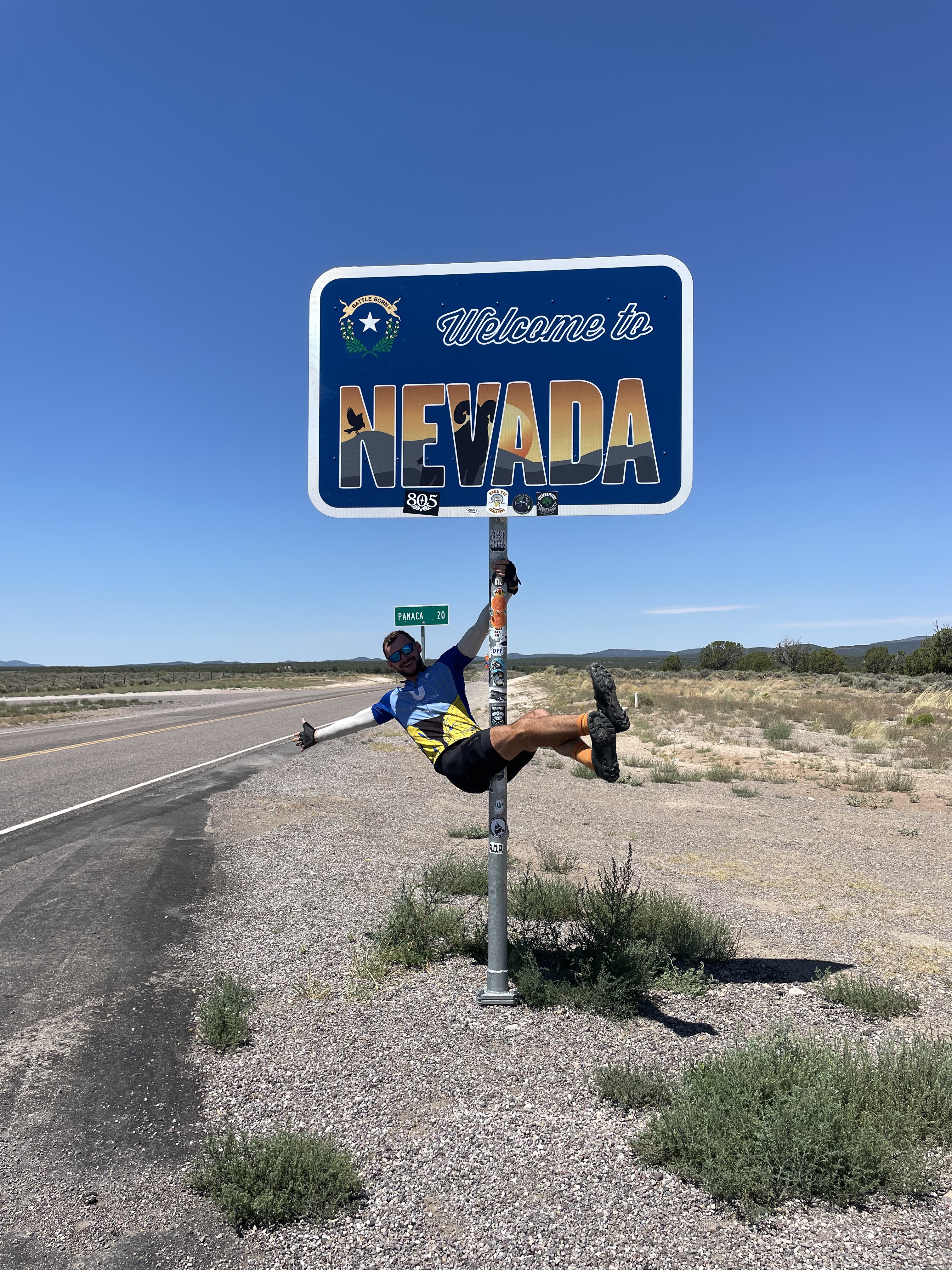 Despite feeling off mentally I was doing well physically up until a rest stop at mile 60. We stopped at the Nevada border and took some fun pictures at the state sign, but then heard that the run van was having mechanical issues a few miles behind us. All of the lug nuts on one of their tires were loose, one had fallen off, and the wheel was very close to coming off entirely. Collin rode back to them with the water van to help out, so my group waited out at the water stop for what felt like a very long time. I was on the verge of falling asleep when they got back, with the run van in drivable condition.