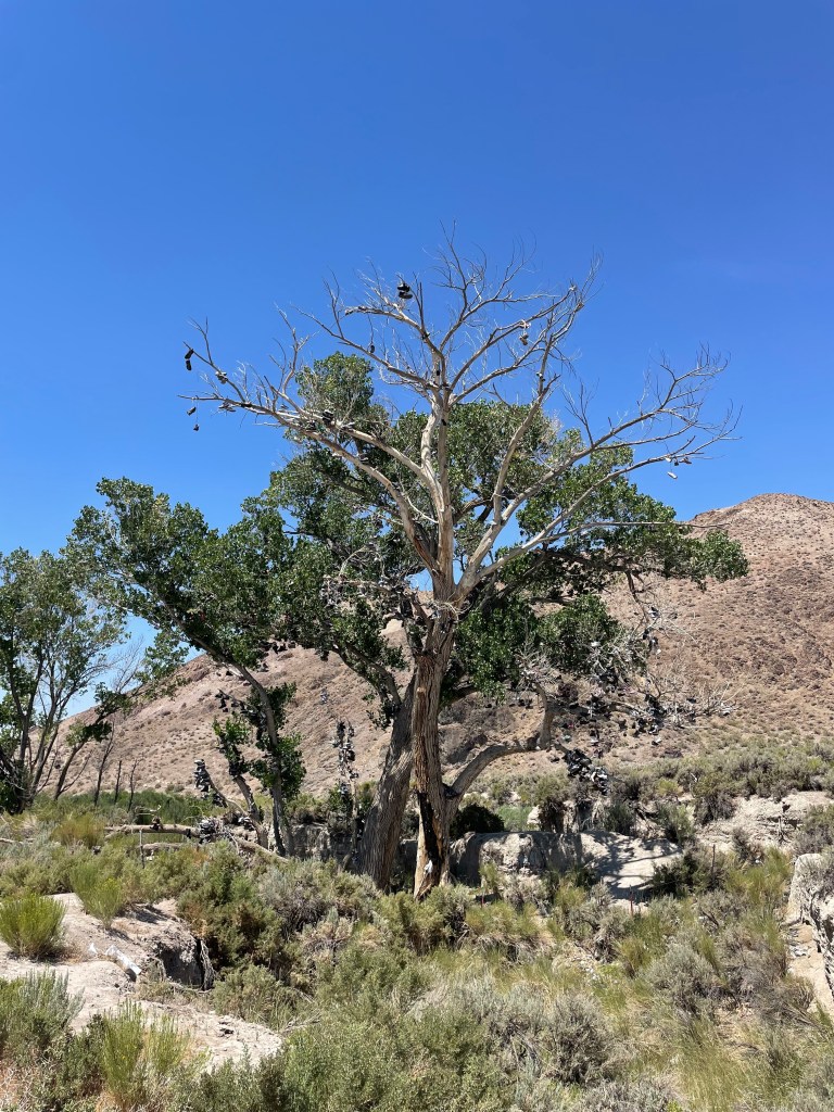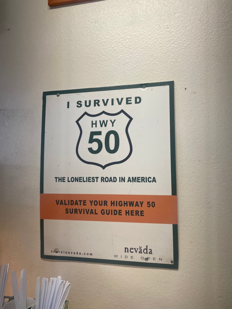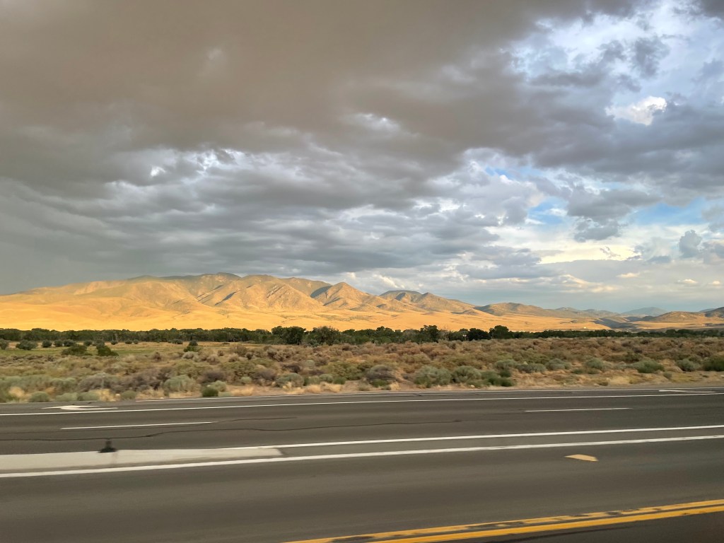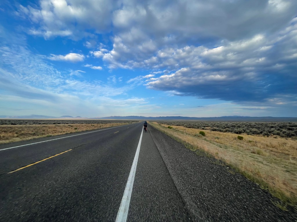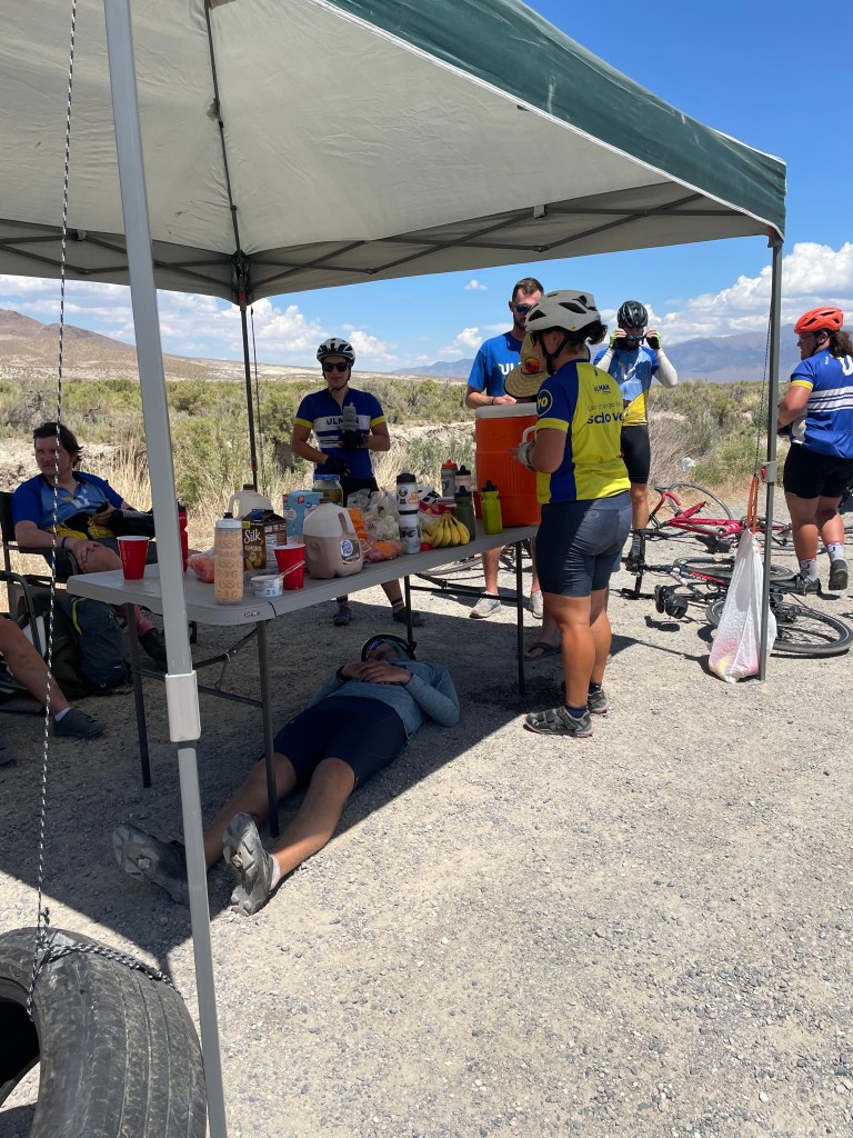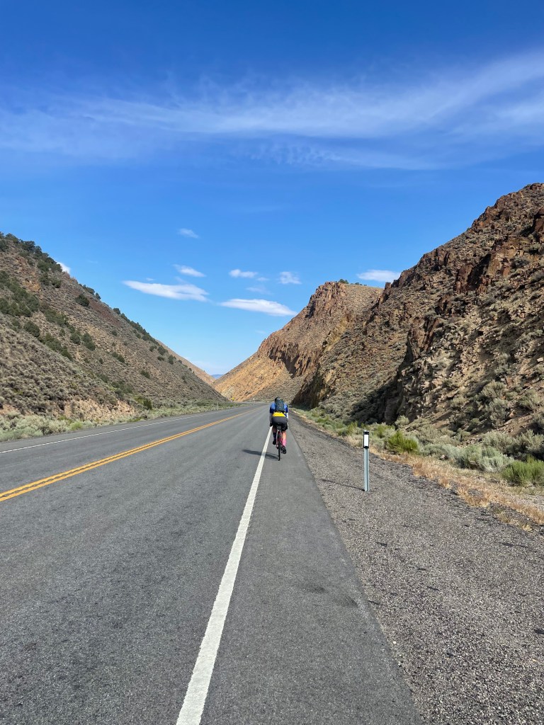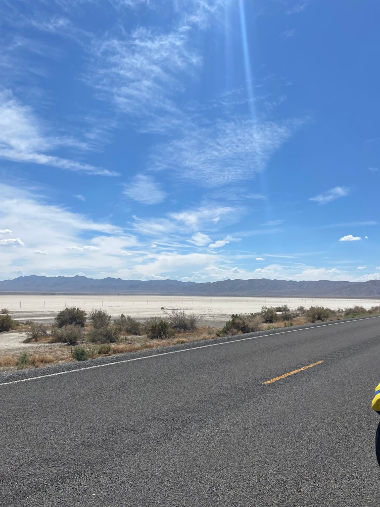 I woke up this morning a little chilly but otherwise well-rested after a night in the van! After a true #4KOK breakfast (a bagel, a banana, and a slice of cake) and a loooong pack-up, we were finally heading out of Austin back on US-50. It was a clear and cold morning but we quickly warmed up on a gradual but long climb to our first water stop. Our groups got very spread out so we waited there for a while before getting back on the road and descending into a valley. While we were waiting we heard a sonic boom– later we learned that the real-life home of Top Gun is in Fallon, NV! We saw a lot of cool planes doing practice drills throughout the day, especially toward the end of the ride.